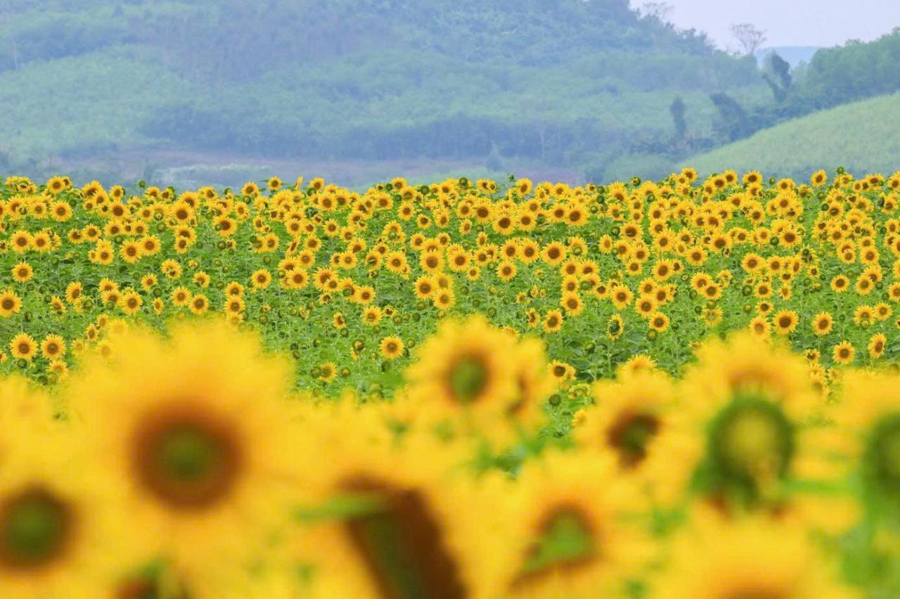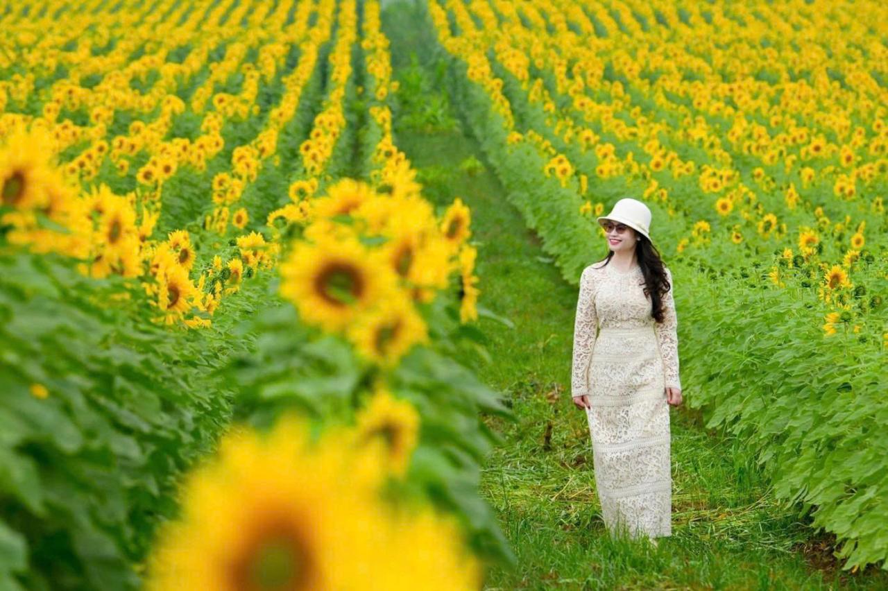 Từ sáng sớm, các tuyến đường dẫn vào khu vực cánh đồng hoa hướng dương đã đông đúc người qua lại. Từng nhóm bạn trẻ, gia đình, cặp đôi, tay cầm máy ảnh, điện thoại háo hức tiến vào không gian ngập tràn sắc hoa. Dưới ánh nắng nhẹ của mùa đông, từng bông hướng dương vươn mình khoe sắc, đồng loạt quay mặt về phía mặt trời. Màu vàng rực rỡ nổi bật trên nền trời xanh nhạt tạo nên khung cảnh vừa hùng vĩ, vừa thơ mộng.