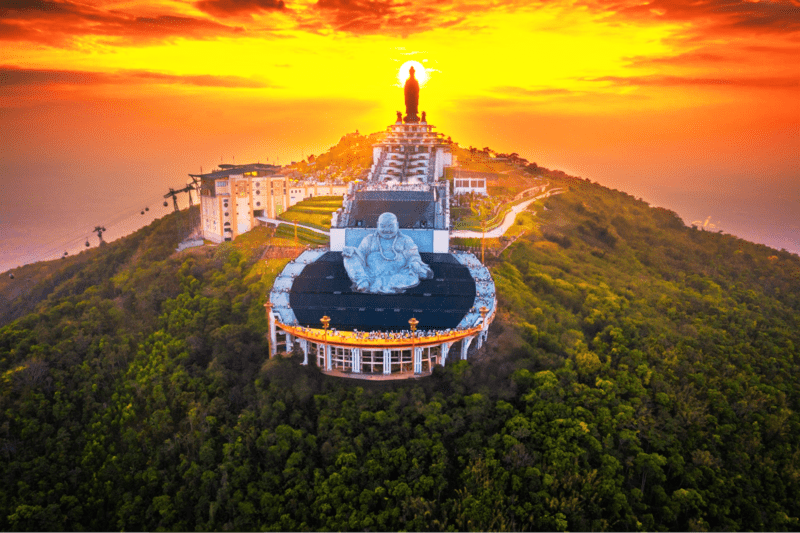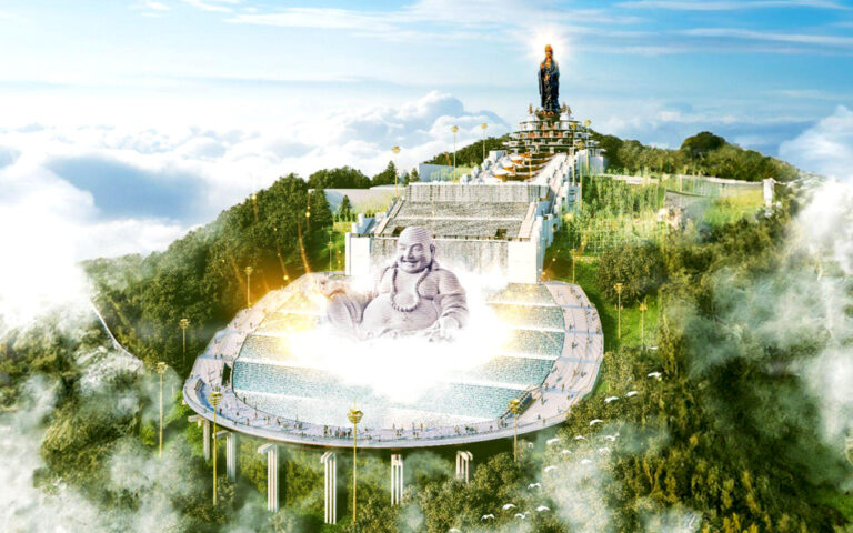 Từ khu vực chùa Bà, du khách chỉ mất khoảng 5 phút đi cáp treo để đặt chân lên đỉnh núi. Tại đây, giữa không gian bao la phủ kín mây trời, du khách được tham quan, chiêm bái tượng Phật Bà Tây Bổ Đà Sơn, Tôn tượng Bồ Tát Di Lặc lớn nhất thế giới.