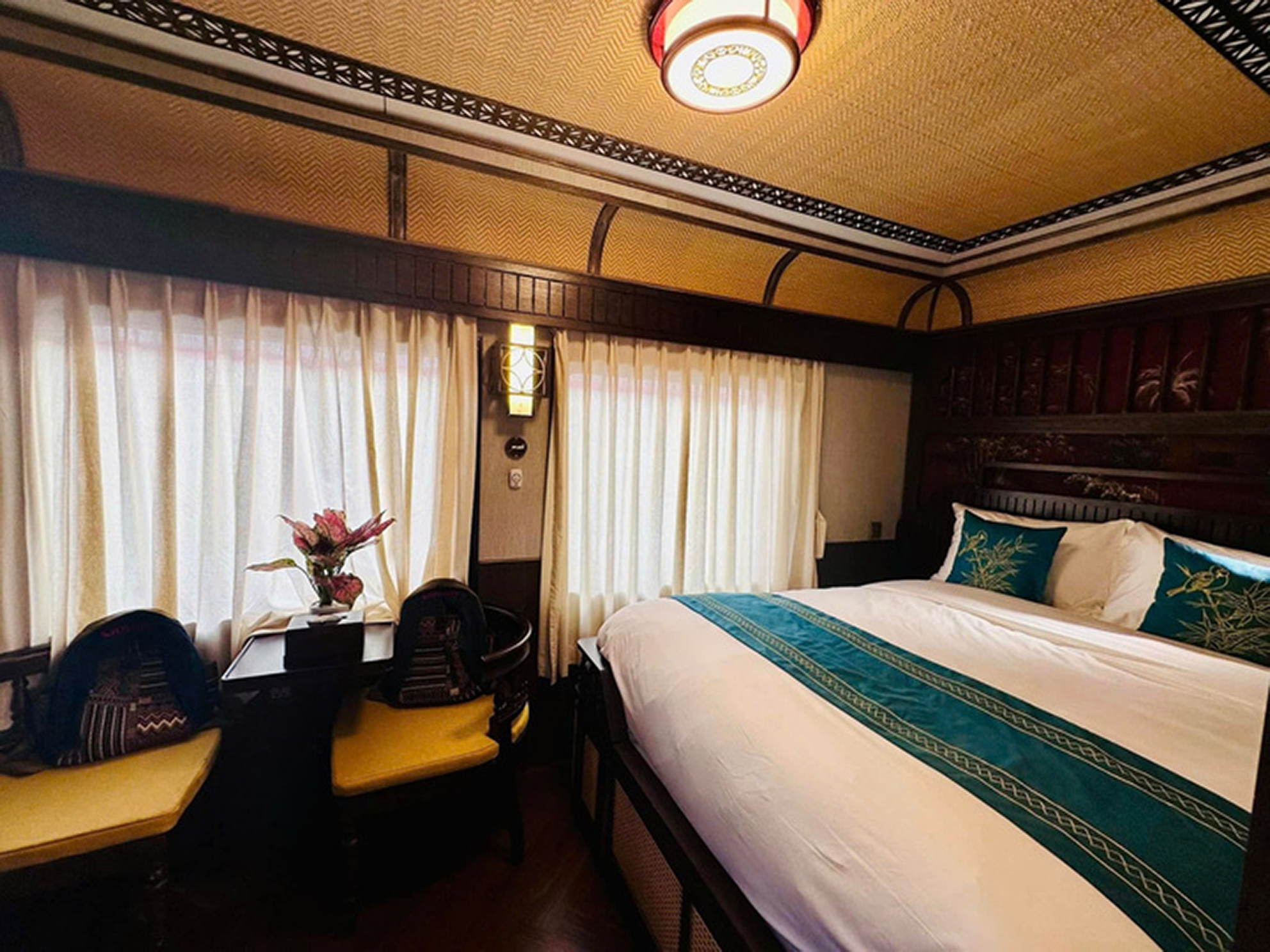 Bước chân lên tàu, du khách sẽ ấn tượng với không gian nội thất lấy cảm hứng từ kiến trúc Indochine thập niên 1930. Gỗ tự nhiên, ánh sáng ấm áp và những đường nét hoài cổ tạo nên không khí trang nhã, mang lại cảm giác như đang sống trong một biệt thự cổ kính di động. Tàu gồm 13 toa, trong đó có 10 toa ngủ cao cấp, 2 toa nhà hàng và 1 toa bếp, đủ để phục vụ tối đa 60 hành khách trong sự riêng tư tuyệt đối.