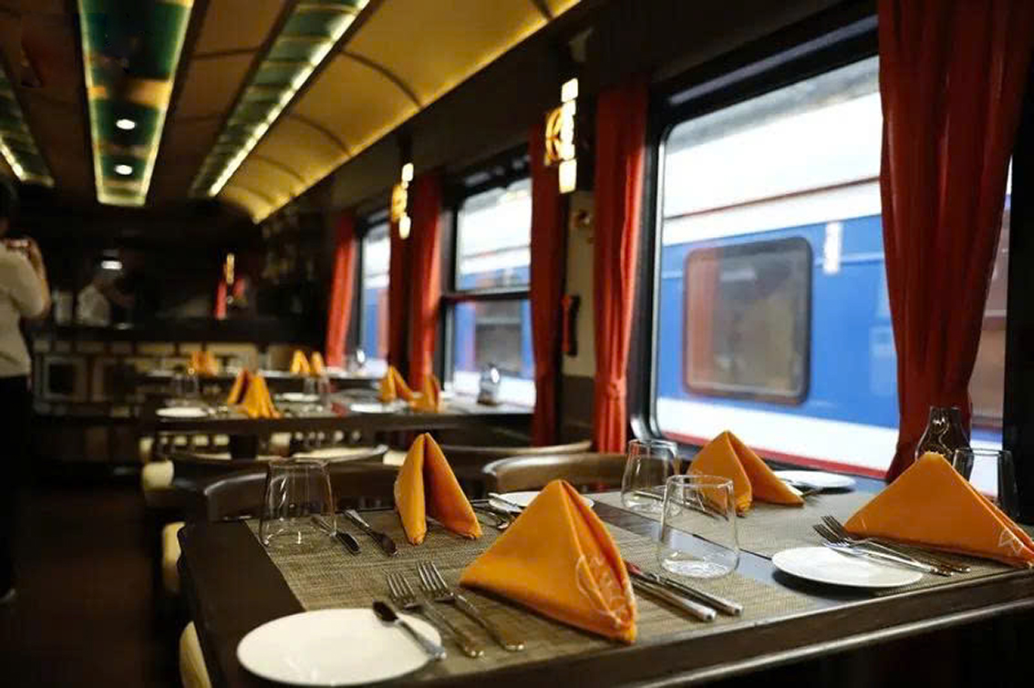 Du khách tham gia hành trình sẽ được phục vụ đầy đủ 3 bữa trên tàu tại không gian riêng biệt tại các toa nhà hàng. Các bữa ăn với đa dạng lựa chọn, có đan xen cả ẩm thực nổi tiếng, truyền thống của Việt Nam cũng như quốc tế hiện đại, và được chế biến bởi đầu bếp khách sạn 5 sao. Từ bữa sáng nhẹ nhàng, tiệc trà chiều hay bữa tối theo phong cách fine – dining đều được trình bày đẹp mắt, đem lại cho du khách trải nghiệm cao cấp bằng cả vị giác lẫn thị giác.