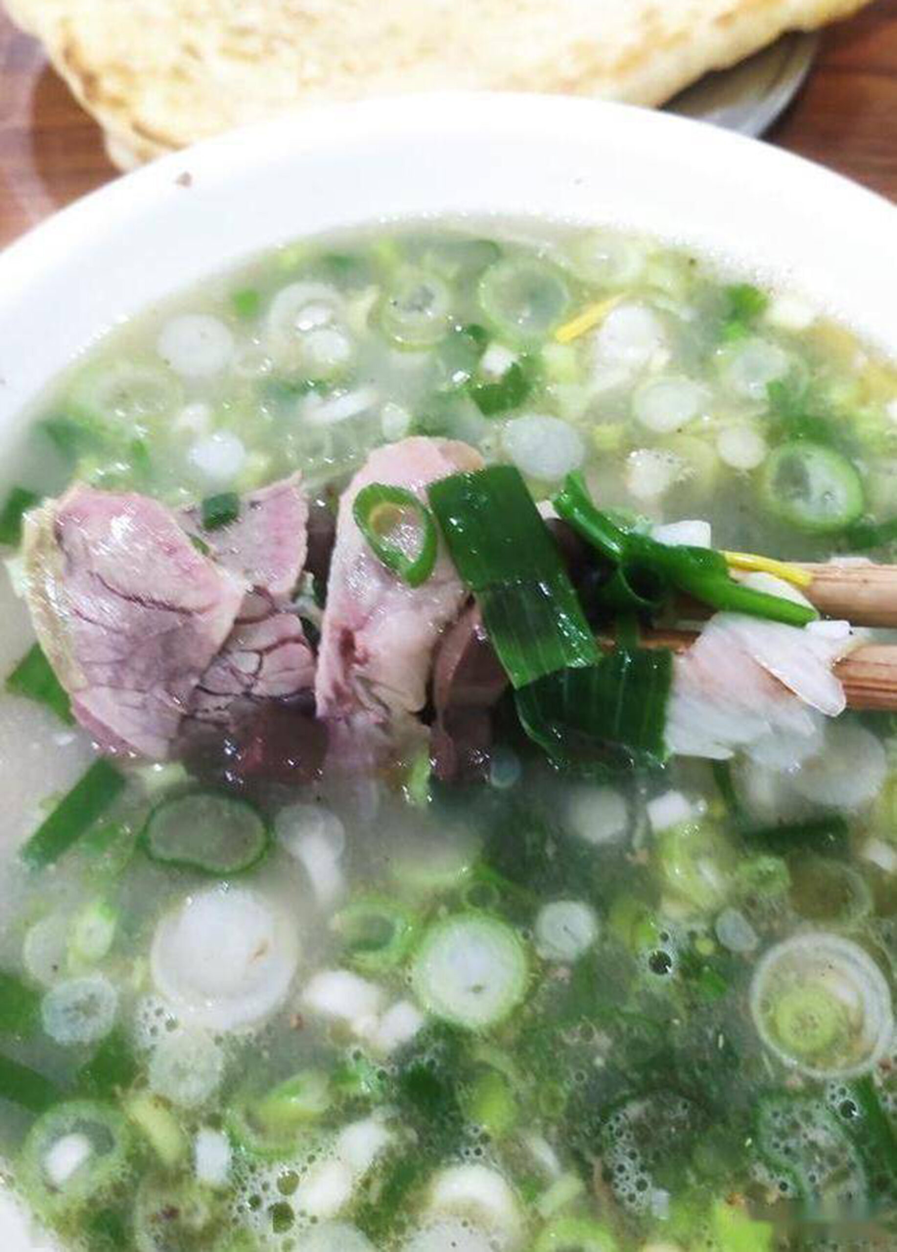 Thịt lừa ninh nhừ cùng hơn 30 loại gia vị trong nồi đồng cổ, nước dùng sánh đậm như sữa, có mỡ ánh vàng, thịt mỏng, mềm, béo ngậy. Món này ăn cùng bánh giòn xé nhỏ, chan nước lèo sôi ùng ục – đó không chỉ là món ăn mà là tinh thần “buổi sáng một bát canh, thần tiên cũng phải ghen”.