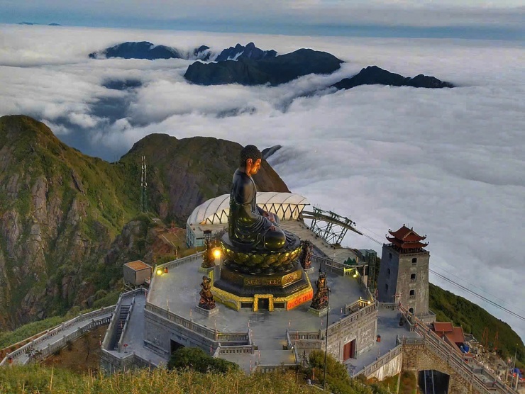 Biển mây mềm mịn như dòng thác trôi xuống những ngọn núi. Buổi sáng sớm, khung cảnh nơi đây tĩnh lặng, uy nghiêm và đẹp đẽ. Khi mặt trời lên cao hơn, mây dần tản ra. Và mây trôi lững lờ dưới chân đại tượng Phật A Di Đà nằm trong quần thể du lịch ở đỉnh Fansipan. Đại tượng Phật cao 13m, đặt trên đài sen cao 8m, được chế tác từ hàng vạn tấm đồng, trọng lượng khoảng 50 tấn.