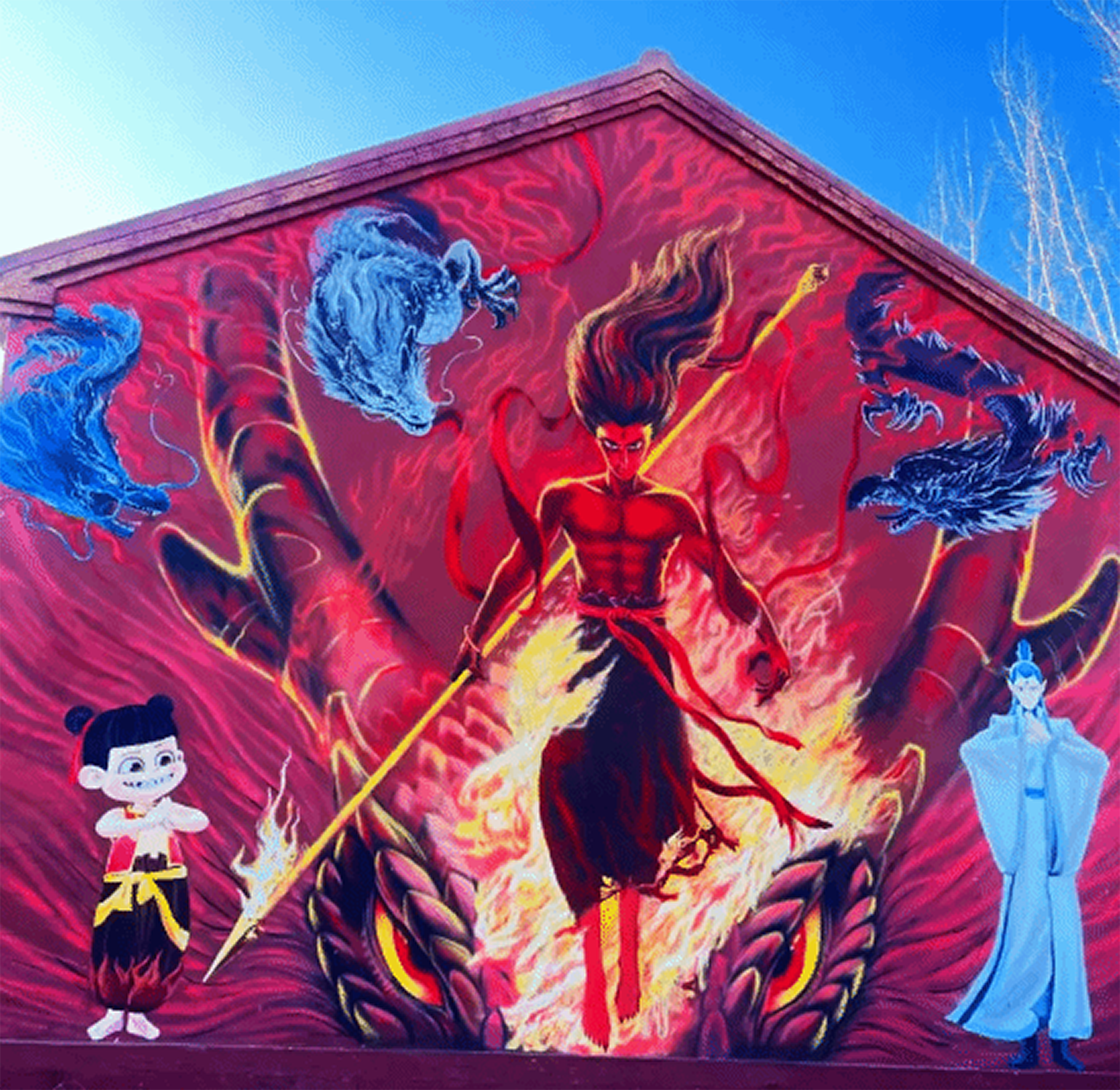 Thẩm Tịnh Vũ, một họa sĩ vẽ tranh tường ở thôn Thẩm Gia, khu Chu Thôn, địa phương cấp thị Truy Bác thuộc tỉnh Sơn Đông, Trung Quốc đã đăng tải đoạn video ghi lại cảnh anh vẽ Na Tra lên tường lên mạng xã hội, thu hút đông đảo cư dân mạng. Bức tranh tường này cao 10 mét, rộng 8 mét, được hoàn thành sau 7 ngày.