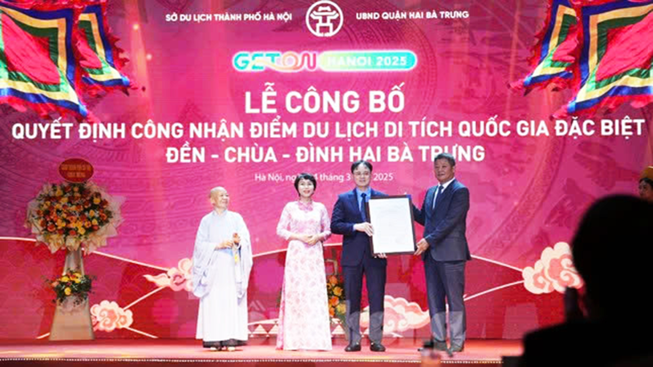 Tối 4/3, Sở Du lịch TP. Hà Nội và quận Hai Bà Trưng tổ chức chương trình Du lịch Hà Nội chào 2025 – Get on Hanoi 2025 và công bố quyết định công nhận điểm du lịch Cụm di tích quốc gia đặc biệt Đền, Chùa, Đình Hai Bà Trưng .